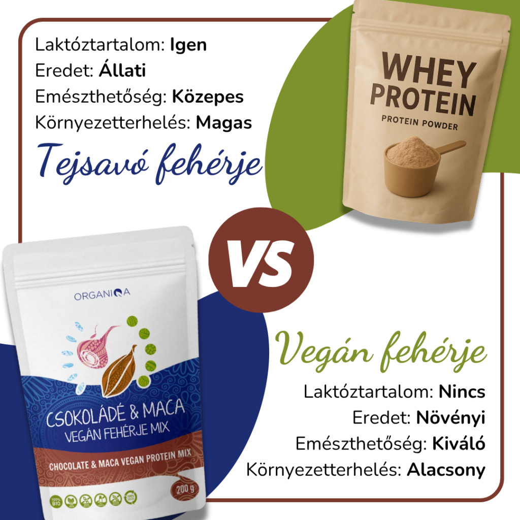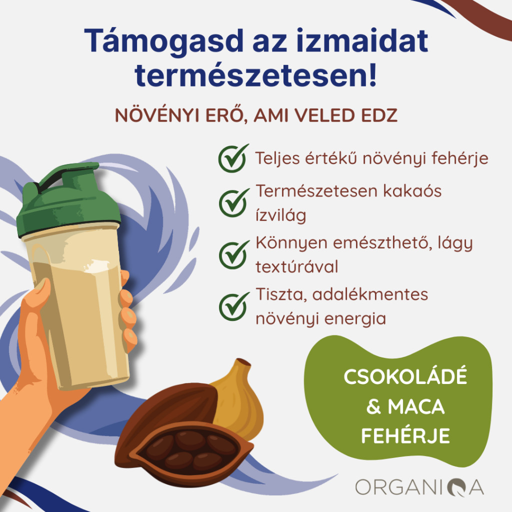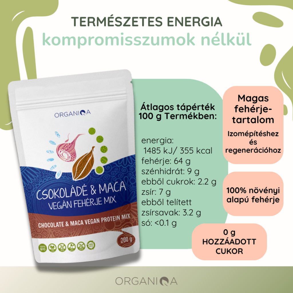 Bio Csokoládé-Maca Vegán Fehérje Mix 200g 100% növényi fehérje keverék csokoládé ízben, cukor, glutén és egyéb felesleges adalékanyagok nélkül. Az Organiqa csokoládé-maca vegán fehérje mix egy különleges bio fehérje keverék, amely nélkülözhetetlen a növényi étrendet követők fehérjepótlásához. Azon kevés fehérjeporok közé tartozik, melyek nem tartalmaznak az összetevők között semmilyen adalékot, ízesítőt, még természetes aroma néven sem. Kizárólag növényi alapanyagokból készül. Bio rizs- és borsófehérje adja az alapot, ezt ízesítettük perui bio maca és kakaóporral.