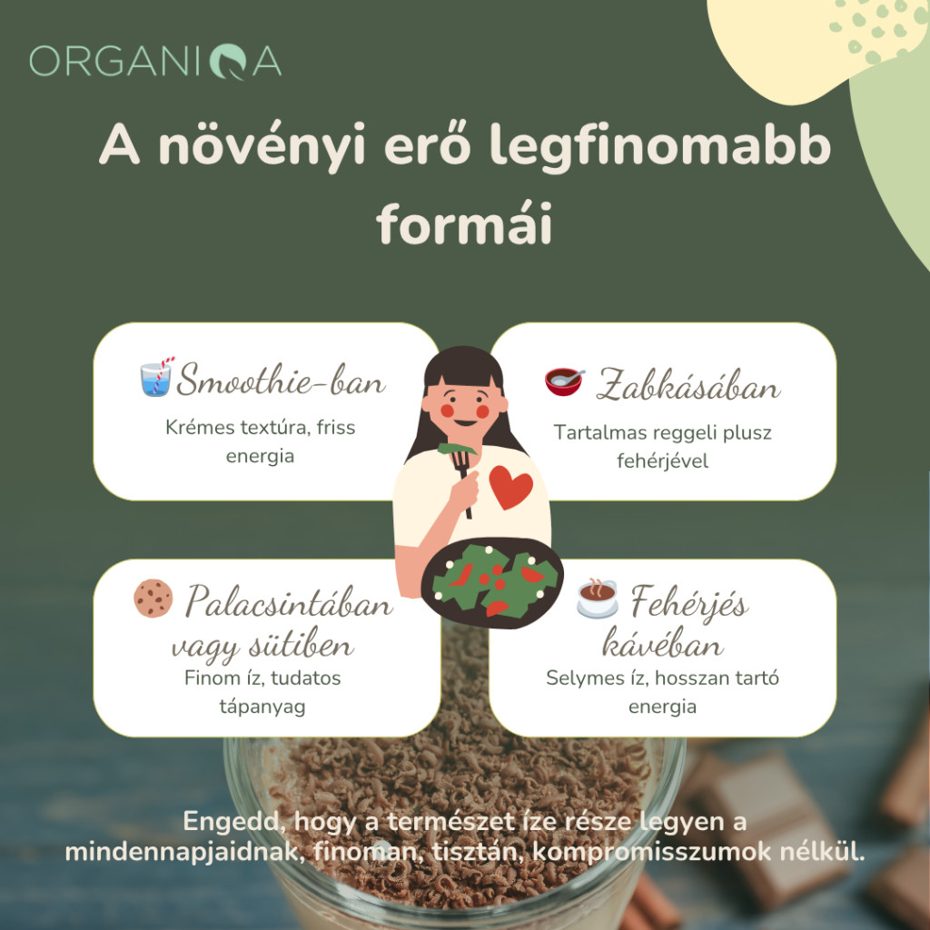 Bio Csokoládé-Maca Vegán Fehérje Mix 400g 100% növényi fehérje keverék csokoládé ízben, cukor, glutén és egyéb felesleges adalékanyagok nélkül. Az Organiqa csokoládé-maca vegán fehérje mix egy különleges bio fehérje keverék, amely nélkülözhetetlen a növényi étrendet követők fehérjepótlásához. Azon kevés fehérjeporok közé tartozik, melyek nem tartalmaznak az összetevők között semmilyen adalékot, ízesítőt, még természetes aroma néven sem. Kizárólag növényi alapanyagokból készül. Bio rizs- és borsófehérje adja az alapot, ezt ízesítettük perui bio maca és kakaóporral.