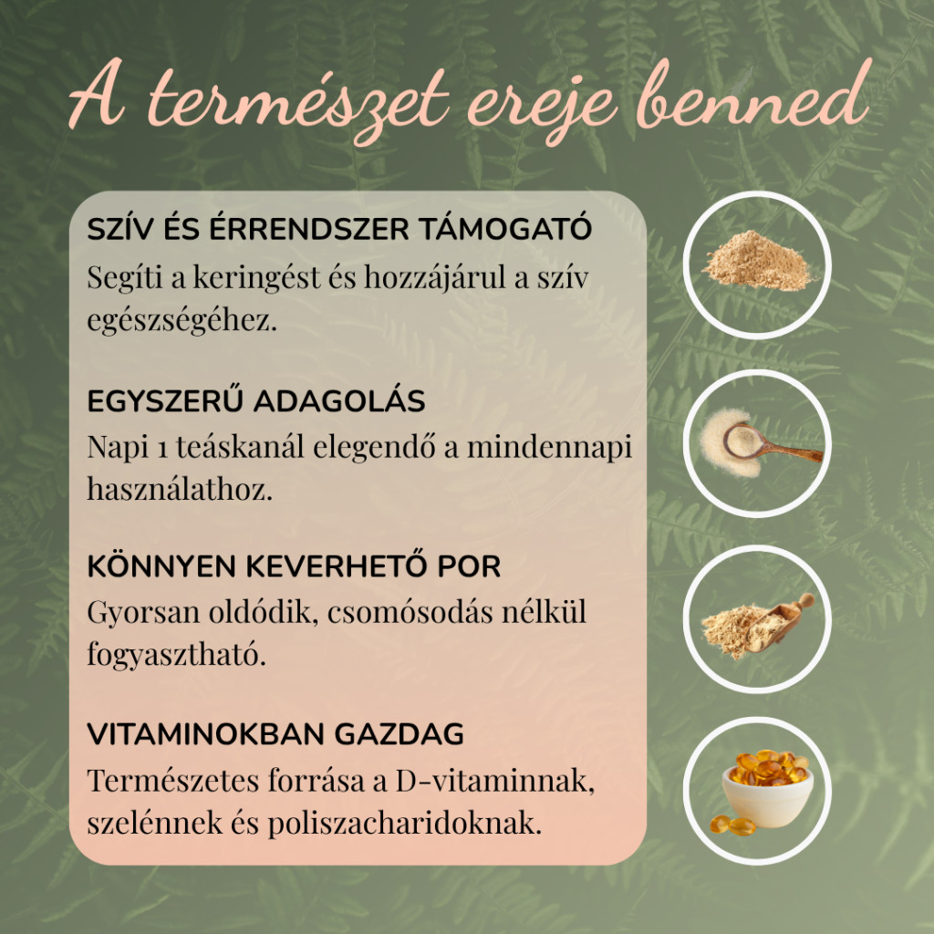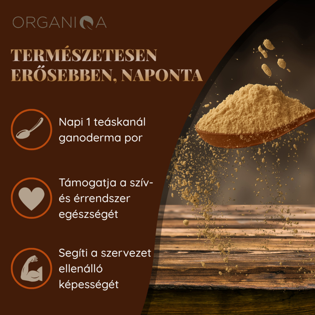Így fogyaszd: Napi 1-2 kávéskanál ganoderma por reggel és este forró italba, gyümölcslébe vagy turmixba keverve. Keserű íze kávéban jól leplezhető. Ne fogyaszd várandósság idején, vagy véralvadási zavarok esetén.