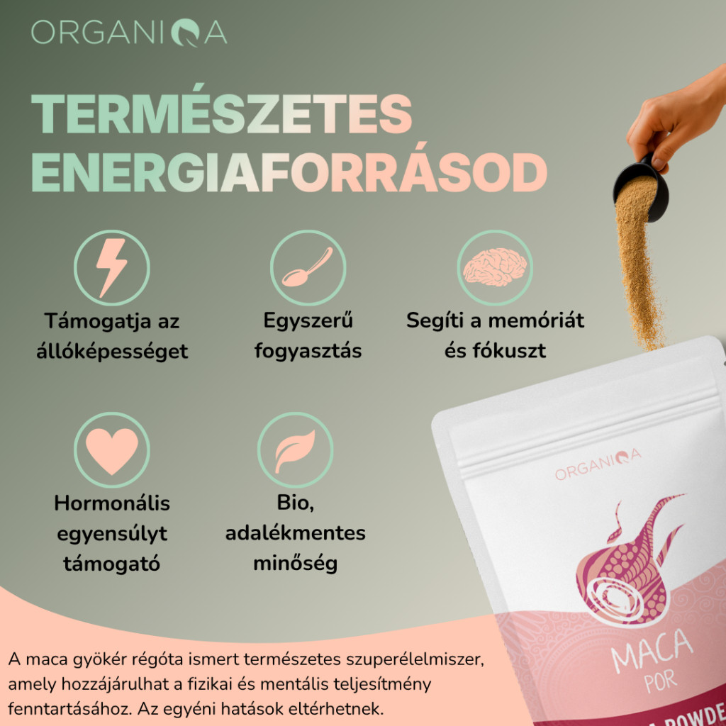 Rendszeres fogyasztása éberebbé tesz, továbbá segítheti a koncentrációt, ezáltal könnyebben tudsz összpontosítani az igazán fontos dolgokra. Egy 2009-ben publikált tanulmány szerint a maca gyökér por energiaszint növelő tulajdonsága miatt hasznos tápanyagforrás lehet a sportolók számára, ráadásul a hangulat javításához is hozzájárulhat.