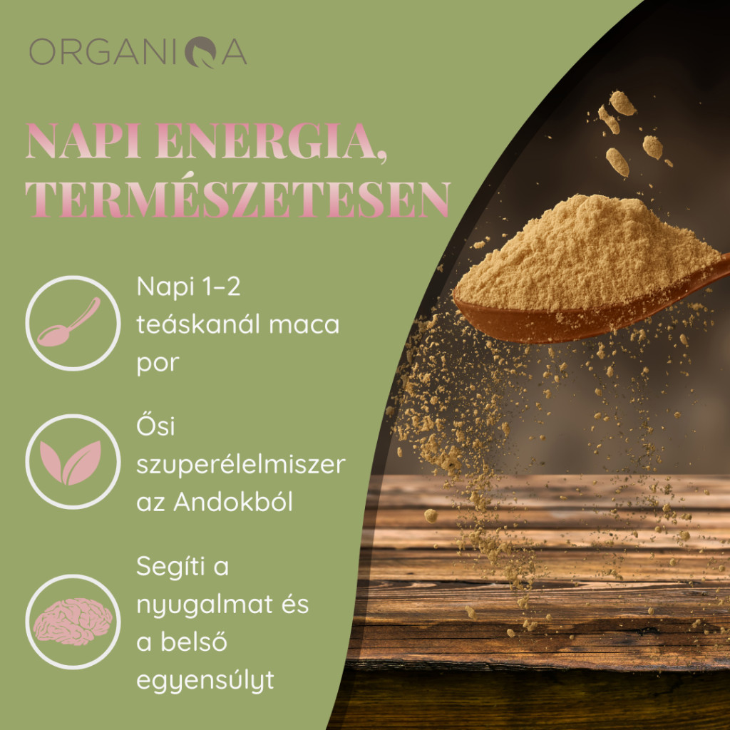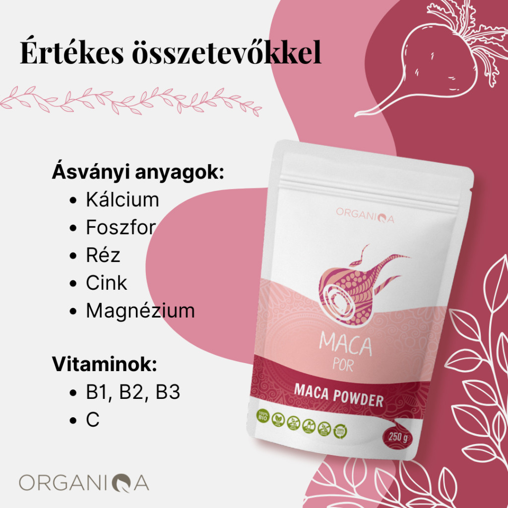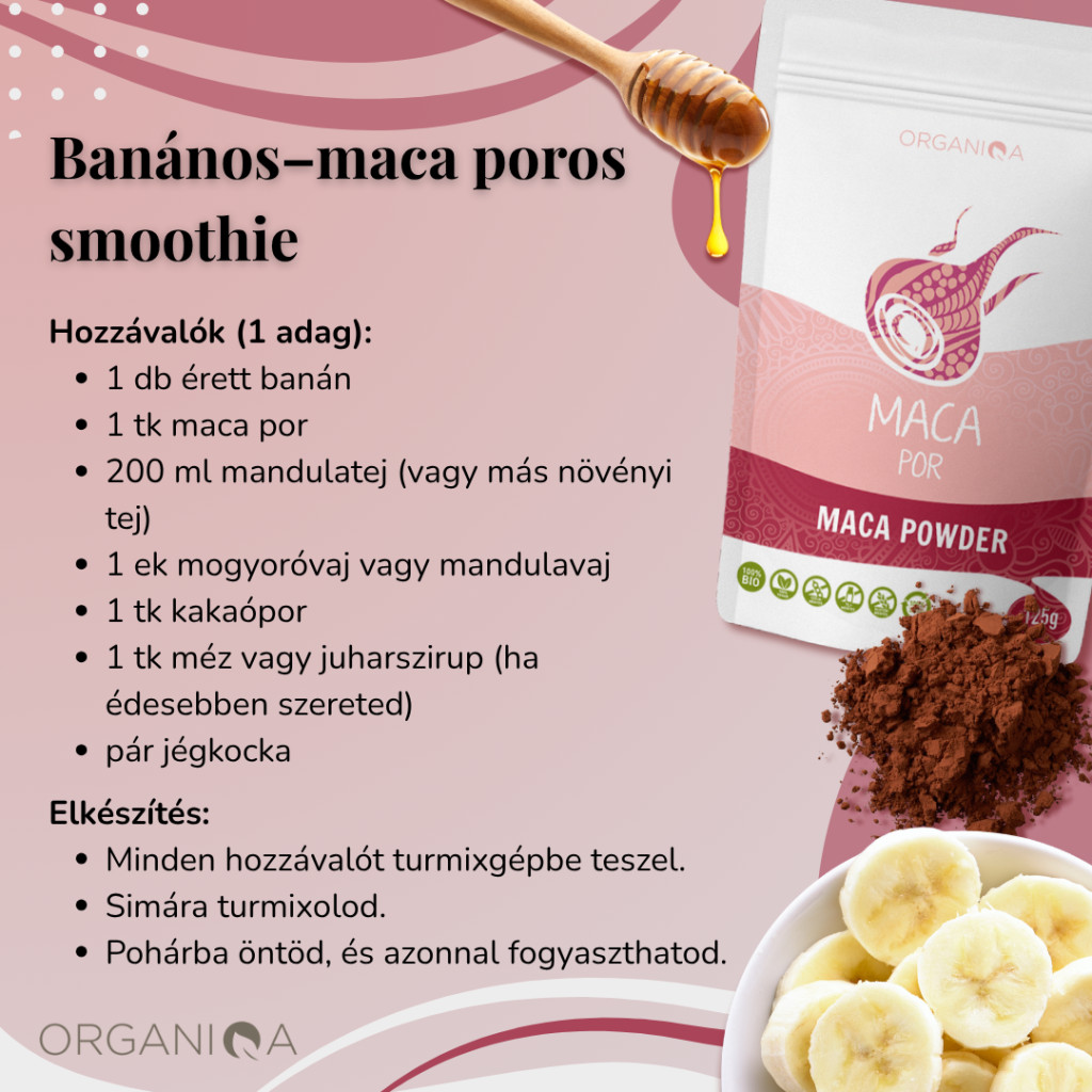 Így fogyaszd: Íze elég jellegzetes, kissé a retek ízére emlékeztet, keverd valamilyen gyümölcsléhez vagy turmixhoz. A napi adag kezdetben 1 teáskanál maca por, melyet akár 2-3 teáskanálra is növelhetsz.
