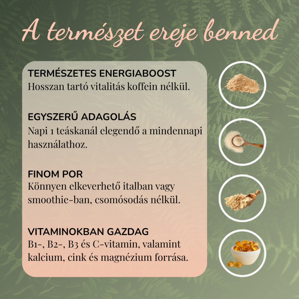 A perui maca gyökér por kifejezetten gazdag aminosavakban, fitonutriensekben, emellett vitaminokban és ásványi anyagokban is bővelkedik. A bio maca gyökér por olyan természetes élénkítő szer, amely nem tartalmaz koffeint, így könnyen beépítheted az étrendedbe. Kiváló természetes hormonszabályozó - a női- és férfi hormonrendszer egészséges működéséhez ajánlott.
