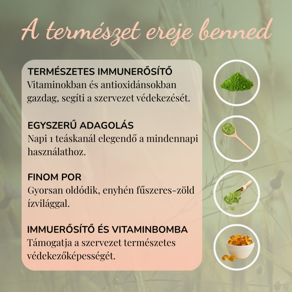 Így fogyaszd: Keverd valamilyen gyümölcsléhez vagy turmixhoz A napi adag 1 teáskanál szuperzöld mix por, melyet igény szerint növelhetsz. Nagyon fontos, hogy sok folyadékot (lehetőleg tiszta vizet) fogyassz mellette, hogy segítsd a salakanyagok kiürülését.