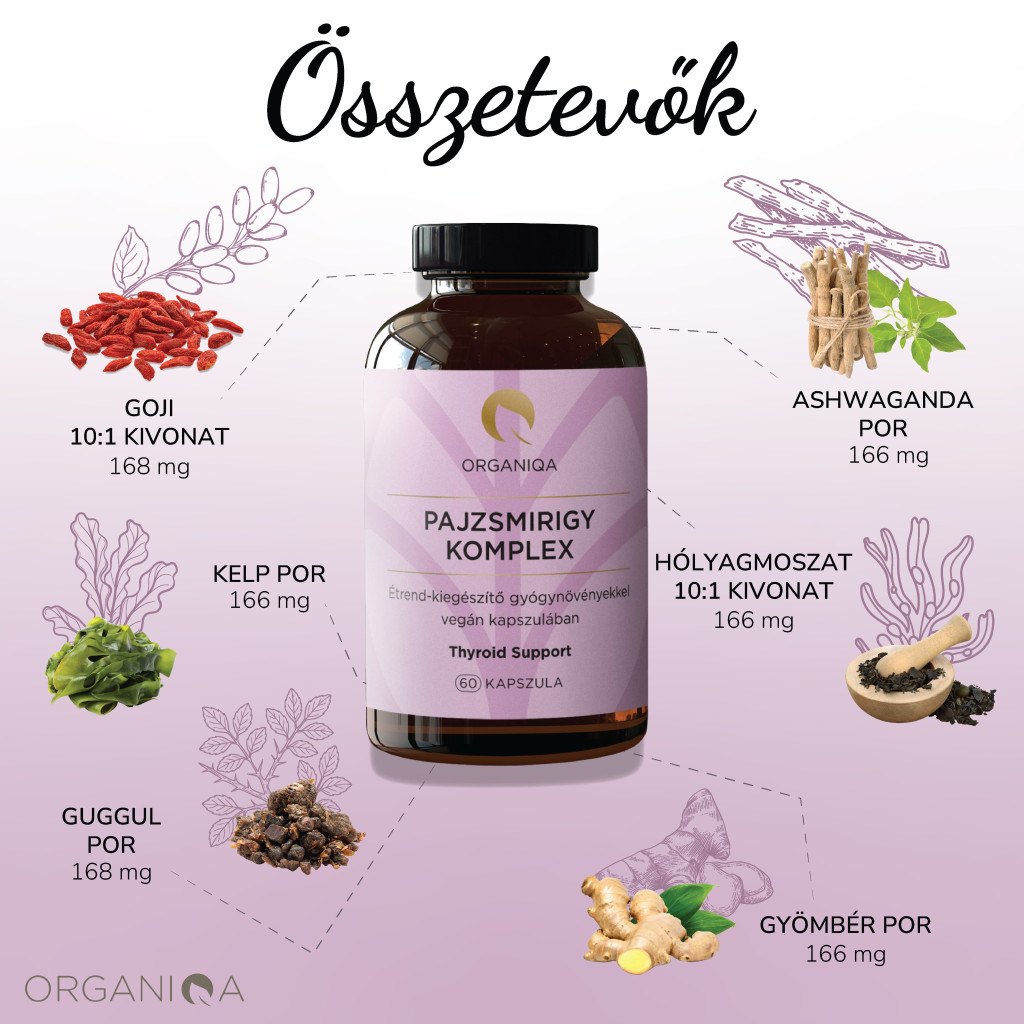 Guggul: Az ájurvédikus orvoslás kedvelt szere pajzsmirigy problémák kezelésére. Tanulmányok kimutatták, hogy a guggul használata enyhítheti a pajzsmirigy alulműködés tüneteit a T3 és T4 szintek növelésével, a TSH normalizálásával és a pajzsmirigyhormonok májban történő átalakításának javításával. A guggul természetesen a pajzsmirigyre is jótékonyan hat. Támogatja a pajzsmirigy jódfelvevő képességét, és számos fontos pajzsmirigy enzim aktivitását. Ezen kívül, a guggul a támogathatja a normál vércukorszintet és az egészséges testsúlyt is. Ashwagandhával kombinálva hatása fokozódik.